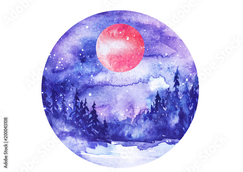 Watercolor painting, illustration, greeting card. Forest, suburban landscape, silhouettes of fir trees, pines, trees and bushes, the night sky with stars. Blue, purple color. Watercolor round logo - Buy this stock illustration